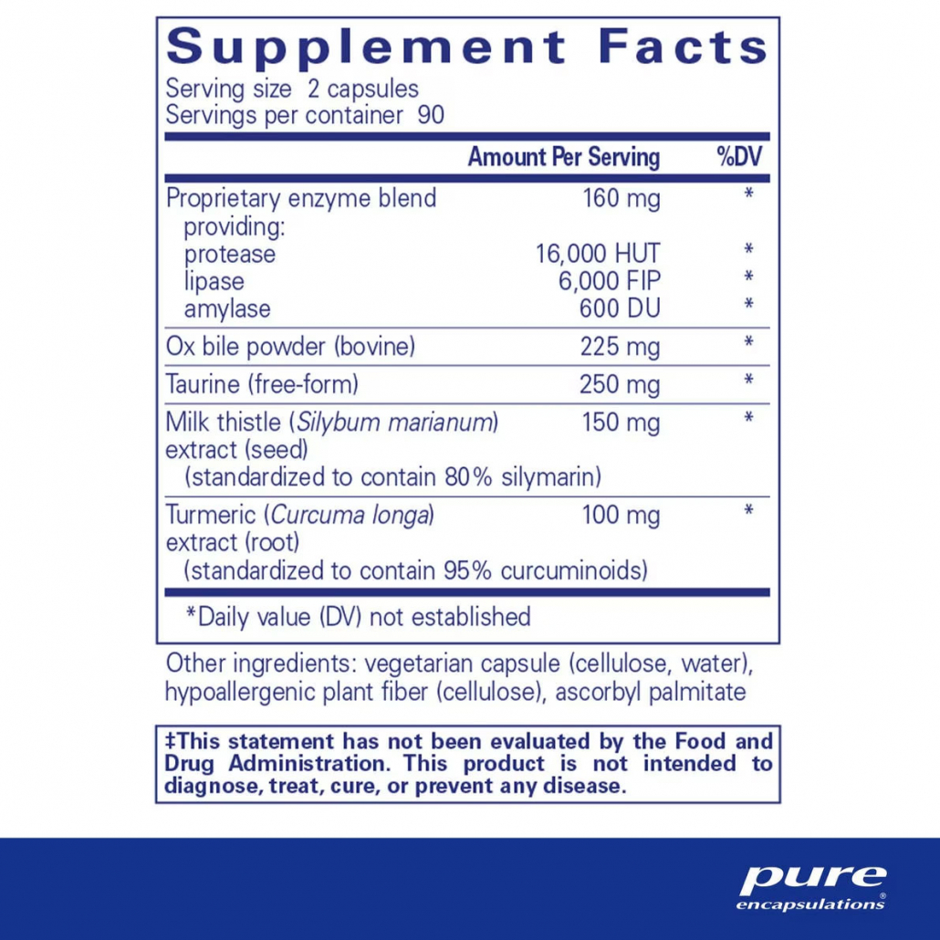 Offers a unique mix of digestive enzymes, bile salts, taurine and herbal extracts