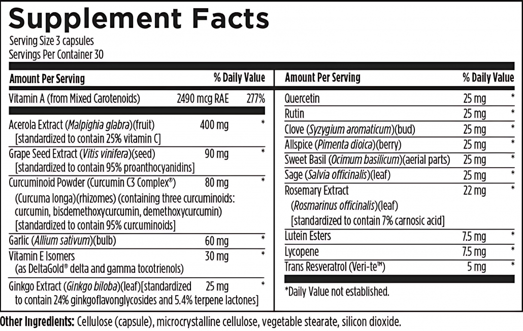 Synergistic blend of vitamins, herbs, and botanical extracts to support antioxidant status and healthy function of cell membranes, proteins, and enzymes.