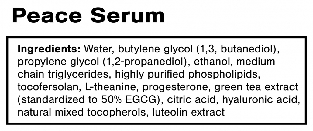 - Peace Serum is a topical serum providing 8 mg of bioidentical progesterone per 2 pumps.